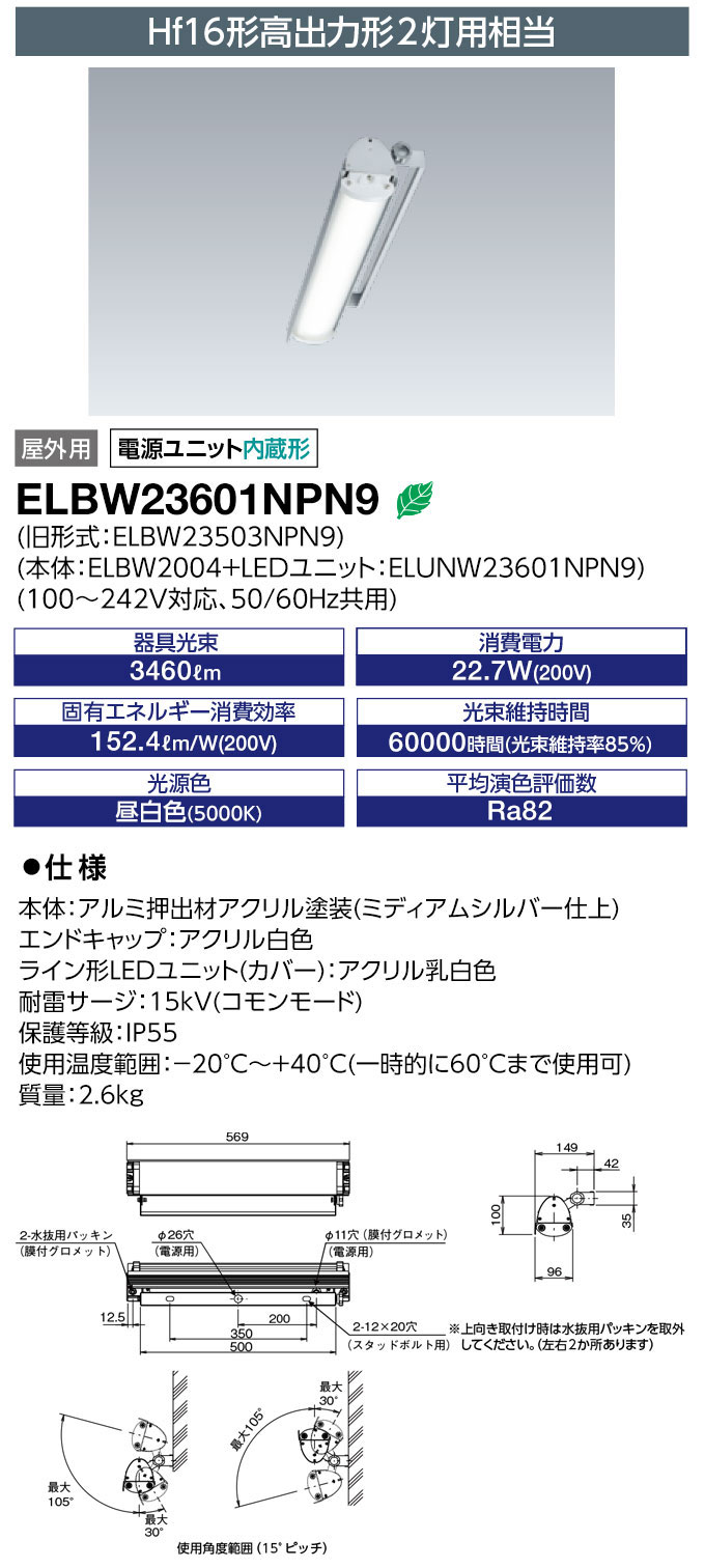 ELBW23601NPN9 || LEDÅê¸÷´ï ´äºêÅŵ¤¡Ú¥ì¥Ç¥£¥ª¥Ã¥¯¥Þ¥ë¥Á¥é¥¤¥ó ¥Ö¥é¥±¥Ã¥È·Á 500mm¥¿¥¤¥×¡ÛHf16W¹â½ÐÎÏ·Á¡ß2ÅôÍÑ ÅŸ»¥æ¥Ë¥Ã¥ÈÆâ¢ ľÉÕ¥¿¥¤¥× ³ÑÅÙÄ´À°²Äǽ ²°³°ÍÑ IP55 ÃëÇò¿§(5000K) 3460lm Ra82 ¾ÃÈñÅÅÎÏ(22.7W/200V»þ) 100-242V ¼÷Ì¿(60000h) [br]