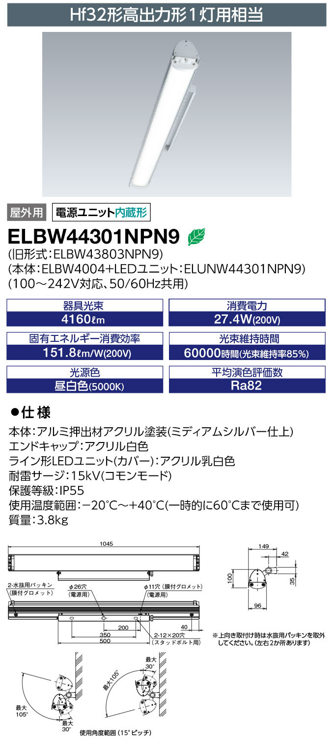 ELBW44301NPN9 || LEDÅê¸÷´ï ´äºêÅŵ¤¡Ú¥ì¥Ç¥£¥ª¥Ã¥¯¥Þ¥ë¥Á¥é¥¤¥ó ¥Ö¥é¥±¥Ã¥È·Á 1000mm¥¿¥¤¥×¡ÛHf32W¹â½ÐÎÏ·Á¡ß1ÅôÍÑ ÅŸ»¥æ¥Ë¥Ã¥ÈÆâ¢ ľÉÕ¥¿¥¤¥× ³ÑÅÙÄ´À°²Äǽ ²°³°ÍÑ IP55 ÃëÇò¿§(5000K) 4160lm Ra82 ¾ÃÈñÅÅÎÏ(27.4W/200V»þ) 100-242V ¼÷Ì¿(60000h)¡ÚÂå°úÉԲġÛ[br]¡¡1000mm Hf32W¹â½ÐÎÏ·Á¡ß1ÅôÍÑ ÃëÇò¿§